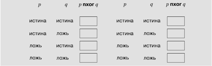 Наконец, подумайте о ситуации, когда нас интересует, чтобы один и только один вход был истинным. Это аналогично операции or («или»), за исключением случая (истина, истина), когда результат является ложным. Такая операция называется исключающим «или» и пишется xor. Если я говорю: «Сейчас я иду в ресторан или (xor) в библиотеку», то лишь одно из этих утверждений может быть истиной, но не оба сразу, если предположить, что я имею в виду мой следующий пункт назначения.