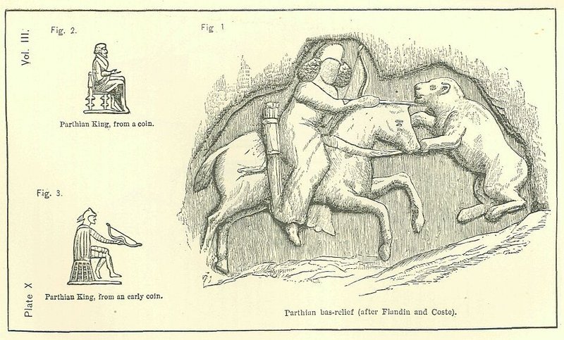 Another, bas-relief, probably, but not quite certainly Parthian, exists in the gorge of Sir-pul-i-zohab, and has been recently published in the great work of M. Flandin. [PLATE VIII.] The inscription on this monument, though it has not yet been deciphered, appears to be written in the alphabet found upon the Parthian coins. The monument seems to represent a Parthian king, mounted on horseback, and receiving a chaplet at the hand of a subject. The king wears a cap bound round with the diadem, the long ends of which depend over his shoulder. He is clothed in a close-fitting tunic and loose trowsers, which hang down upon his boots, and wears also a short cloak fastened under the chin, and reaching nearly to the knee. The horse which he bestrides is small, but strongly made; the tail is long, and the mane seems to be plaited. Thus far the representation, though somewhat heavy and clumsy, is not ill-drawn; but the remaining figure—that of the Parthian subject—is wholly without merit. The back of the man is turned, but the legs are in profile; one arm is ridiculously short, and the head is placed too near the left shoulder. It would seem that the artist, while he took pains with the representation of the monarch, did not care how ill he rendered the subordinate figure, which he left in the unsatisfactory condition that may be seen in the preceding woodcut.