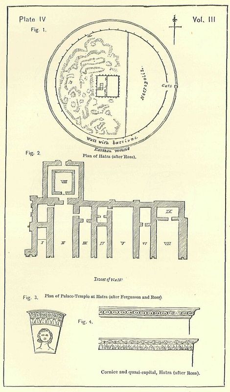 The city of Hatra was enclosed by a circular wall of great thickness, built of large square-cut stones, and strengthened at intervals of about 170 yards by square towers or bastions. [PLATE IV. Fig. 1.] Its circumference considerably exceeded three miles. Outside the wall was a broad and very deep ditch, and on the further side of the ditch was an earthen rampart of considerable height and thickness. Two detached forts, situated on eminences, commanded the approaches to the place, one towards the east, and the other towards the north. The wall was pierced by four gateways, of which the principal one faced the east.