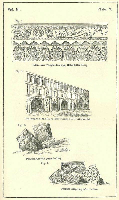 The most imposing remains which seem certainly assignable to the Parthian period are those of Hatra, or El-Hadhr, visited by Mr. Layard in 1846, and described at length by Mr. Ross in the ninth volume of the "Journal of the Royal Geographical Society," as well as by Mr. Fergusson, in his "History of Architecture." Hatra became known as a place of importance in the early part of the second century after Christ. It successfully resisted Trajan in A.D. 116, and Severus in A.D. 198. It is then described as a large and populous city, defended by strong and extensive walls, and containing within it a temple of the Sun, celebrated for the great value of its offerings. It enjoyed its own kings at this time, who were regarded as of Arabian stock, and were among the more important of the Parthian tributary monarchs. By the year A.D. 363 Hatra had gone to ruin, and is then described as "long since deserted." Its flourishing period thus belongs to the space between A.D. 100 and A.D. 300; and its remains, to which Mr. Fergusson assigns the date A.D. 250, must be regarded as probably at least a century earlier, and consequently as indicating the character of the architecture which prevailed under the later Parthians, and which, if Sassanian improvements had not obliterated them, we should have found upon the site of Ctesiphon.