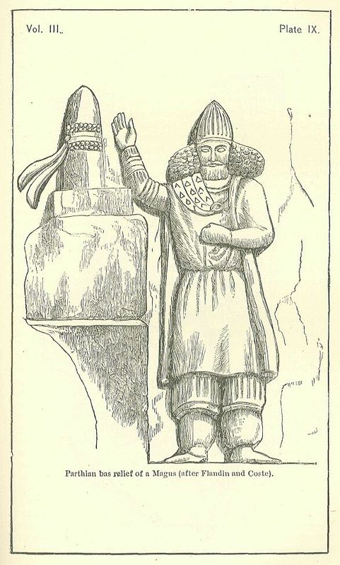 A set of reliefs, discovered by the Baron de Bode in the year 1841, are also thought by the best judges to be Parthian. The most important of them represents a personage of consequence, apparently a Magus, who seems to be in the act of consecrating a sacred cippus, round which have been placed wreaths or chaplets. [PLATE IX.] Fifteen spectators are present, arranged in two rows, one above the other, all except the first of them standing. The first sits upon a rude chair or stool. The figures generally are in an advanced stage of decay; but that of the Magus is tolerably well preserved, and probably indicates with sufficient accuracy the costume and appearance of the great hierarchs under the Parthians, The conical cap described by Strabo is very conspicuous. Below this the hair is worn in the puffed-out fashion of the later Parthian period. The upper lip is ornamented by moustaches, and the chin covered by a straight beard. The figure is dressed in a long sleeved tunic, over which is worn a cloak, fastened at the neck by a round brooch, and descending a little below the knees. The legs are encased in a longer and shorter pair of trowsers, the former plain, the latter striped perpendicularly. Round the neck is worn a collar or necklace; and on the right arm are three armlets and three bracelets. The conical cap appears to be striped or fluted.