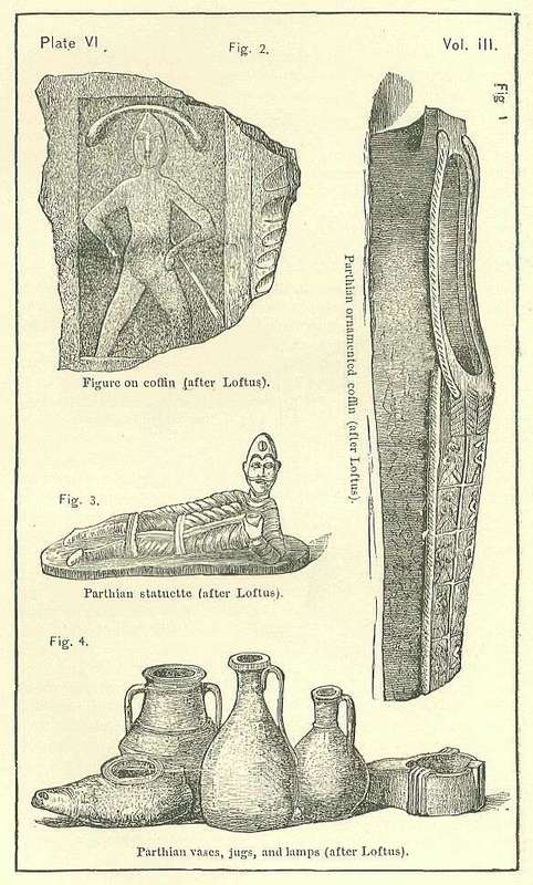 The decorative and fictile art of the Parthians has received no inconsiderable amount of illustration from remains discovered, in the years 1850-1852, in Babylonia. In combination with a series of Parthian coins were found by Mr. Loftus, on the site of the ancient Erech (now Warka), a number of objects in clay, plaster, and metal, enabling us to form a fair idea of the mode in which purely Parthian edifices were decorated during the best times of the empire, and of the style that then prevailed in respect of personal ornaments, domestic utensils, and other objects capable, more or less, of aesthetic handling. The remains discovered comprised numerous architectural fragments in plaster and brick; a large number of ornamental coffins; several statuettes in terra-cotta; jars, jugs, vases, and lamps in earthenware; some small glass bottles; and various personal decorations, such as beads, rings, and earrings.