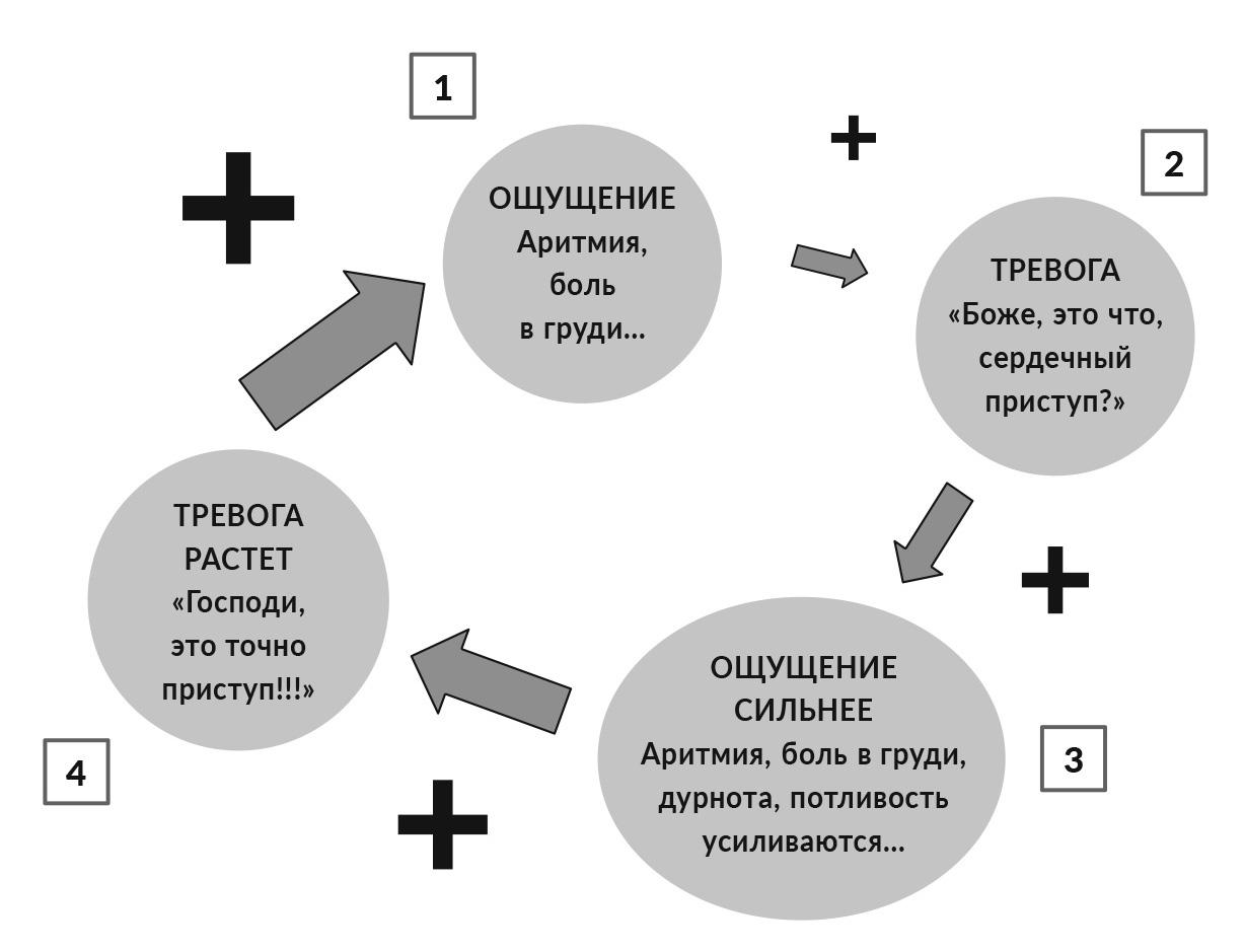 Однажды у человека ни с того ни с сего сердце начинает колотиться или предательски сбиваться с ритма. В силу мнительности или из-за сходства ощущений с симптомами сердечного приступа наш герой ошеломлен и напуган. Теперь представим себе, что несколько недель назад кто-то из его родственников умер как раз от инфаркта. Тогда во время приступа аритмии бедняга почти автоматически подумает: «О нет! У меня точно сердечная недостаточность!» Естественно, от тревоги сердце мгновенно забьется еще быстрее, и — вот проклятье! — ощутив это, человек начнет еще сильнее тревожиться. Порочный круг страха создан!