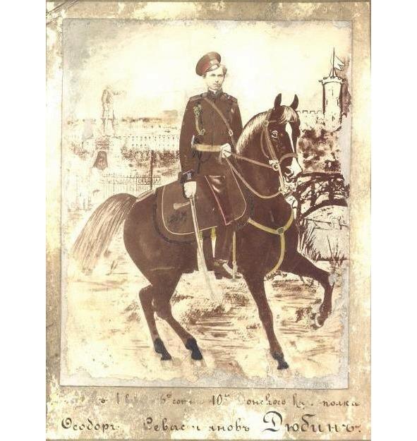 Казаки станицы Митякинской. Кабинетное фото казака 6-й сотни 10 ДКП Дюбина Фёдора Севостьяновича. Надпись на фото.