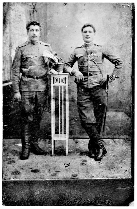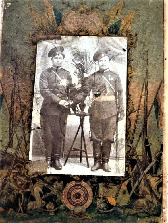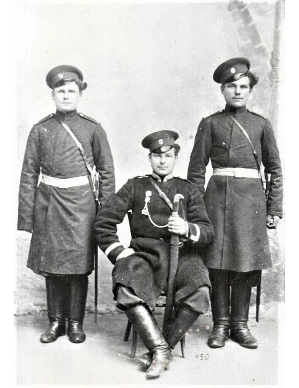 Грешнов Пётр Антонович стоит справа на фото, будущий атаман хутора Никишин во время службы в 10 ДКП. Казаки х. Никишин. Рядом с ним прадед Грешнова Николая — Никишин Яков Степанович. Фото Грешнова Николая.