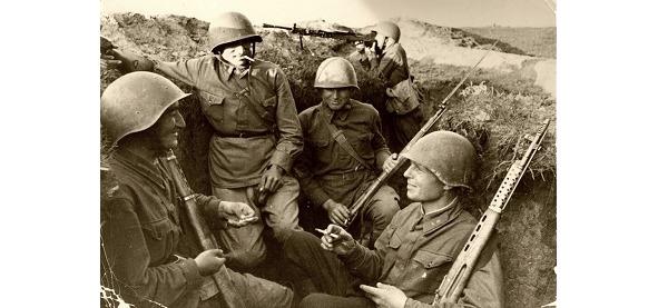 Рядовой Малец, закончив углублять стрелковую ячейку и окоп, устало присел на бруствере, закурил, глядя в небо. Тут же подошел сержант Васильев.
