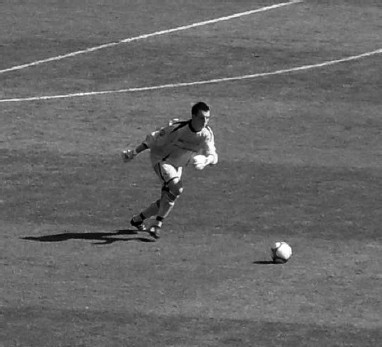 Полевой игрок– так называют всех игроков футбольной команды, за исключением вратаря. Строго говоря, вратарь тоже является полевым игроком, поскольку находится в поле, но, ввиду того что его рабочее место – вблизи собственных ворот, его решено не относить к полевым игрокам. Однако некоторые вратари любят действовать и как полевые игроки (рис. 1.7).