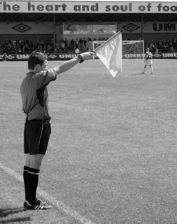 Лайнсмен –помощник главного арбитра, действующий вдоль бровки поля (рис. 1.5). Судейская бригада состоит из трех арбитров: один – главный и два лайнсмена, каждый из которых работает на своей половине поля. Правда, в последнее время раздаются призывы увеличить количество лайнсменов до четырех, чтобы с каждой стороны каждой половины поля было по лайнсмену. Но на момент написания данной книги это предложение все еще было в стадии рассмотрения.