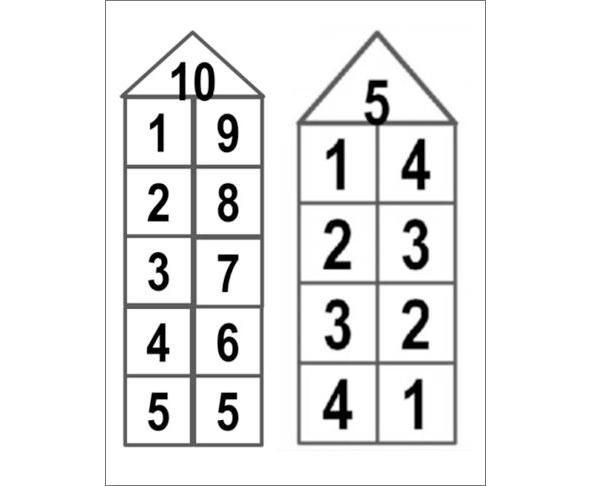 Воображаемый дом с пятью этажами и крышей. На каждом этаже есть две квартиры. В них живут жильцы, а на крыше — хозяин, в данном случае число 5 или 10. На каждом этаже живет столько жильцов — чисел, сколько обозначает число –хозяин на крыше.