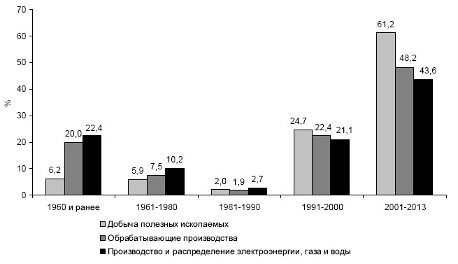 Рис. П1-9. Распределение организаций в секторе КСП по датам образования, секторы промышленности, 2013 г., %