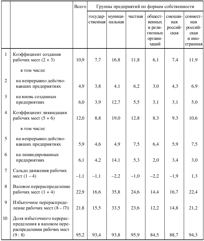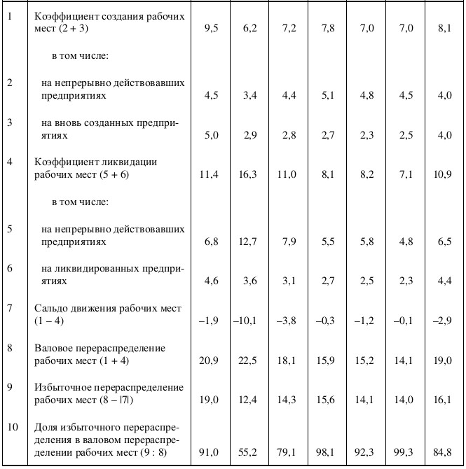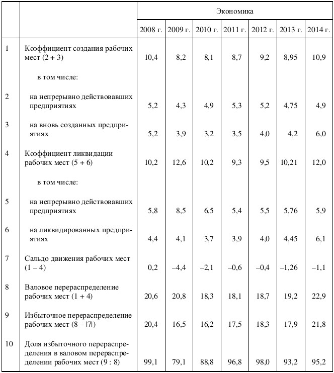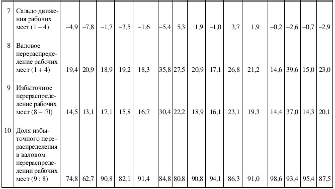 Сумма созданных и ликвидированных рабочих мест в период между t-1 и t характеризует валовое перераспределение рабочих мест между организациями или бизнес-единицами. Если из этого показателя вычесть итоговое изменение занятости, то получим величину избыточного перераспределения рабочих мест. Она показывает, сколько всего рабочих мест было создано и ликвидировано за анализируемый период сверх числа, которое было минимально необходимо, чтобы обеспечить фактически наблюдавшееся итоговое изменение занятости. Высокие значения говорят о том, что структурная перестройка не сталкивается с серьезными ограничениями на рынке труда и потери рабочих мест в стагнирующих секторах экономики успешно компенсируются их наращиванием в растущих секторах.