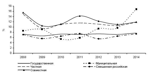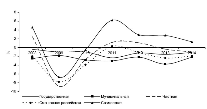 Принятое нами деление на частный и государственный секторы расходится с официальной классификацией, используемой Росстатом. Если, согласно ОКФС, смешанные предприятия рассматриваются как частные, то мы считаем более правильным относить их к группе предприятий, находящихся под контролем государства.