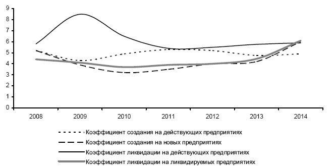 Рис. П1-4. Коэффициенты создания и ликвидации рабочих мест на непрерывно действовавших, вновь созданных и ликвидированных предприятиях, промышленность, 2008–2014 гг., %