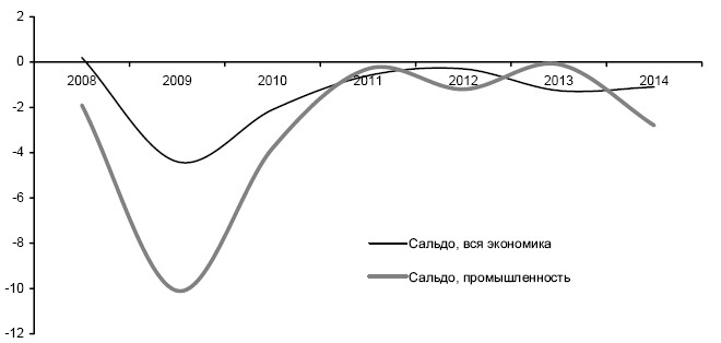 Рис. П1-2. Сальдо движения рабочих мест, вся экономика и промышленность, 2008–2014 гг., %