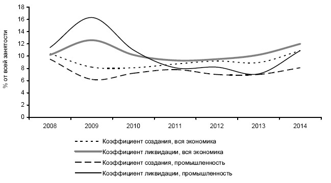Рис. П1-1. Коэффициенты создания и ликвидации рабочих мест, вся экономика и промышленность, 2008–2014 гг., %