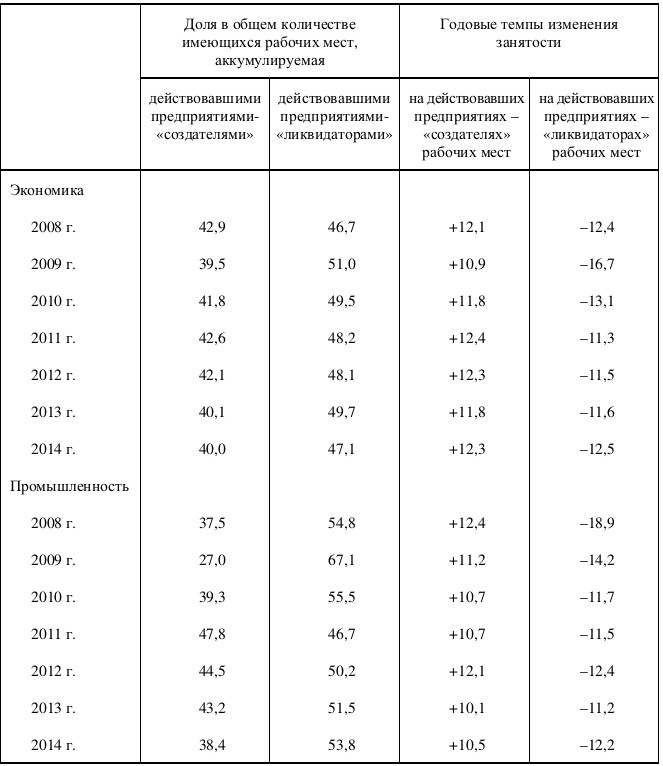 Движение (создание и ликвидация) рабочих мест лежит в основе любых структурных изменений в современной экономике. Замещение менее производительных и технологически устаревших рабочих мест более эффективными и современными вносит значительный вклад в рост агрегированной производительности труда (см. главу 3). Если же замещение идет в обратном направлении (новые рабочие места оказываются менее производительными), то его вклад в рост производительности оказывается отрицательным.