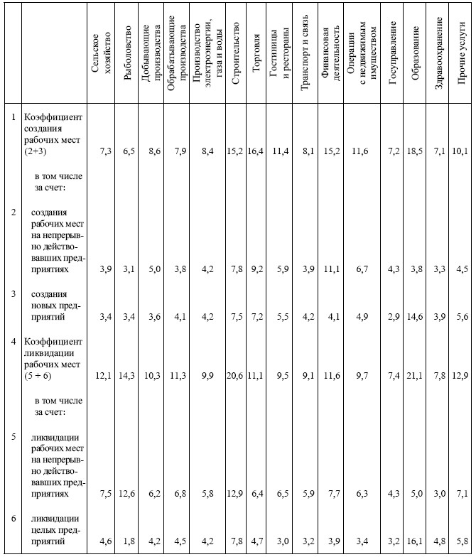 который показывает, какую долю общего количества рабочих мест, имевшихся в экономике, составили ликвидированные рабочие места. Их сокращение также возможно в двух формах: за счет закрытия целых предприятий; за счет потерь в занятости на продолжающих действовать предприятиях. Интенсивность каждого из этих процессов можно оценить с помощью частных коэффициентов ликвидации рабочих мест.