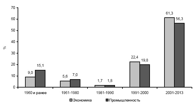 Рис. П1-8. Распределение организаций в секторе КСП по датам образования, вся экономика и промышленность, 2013 г., %