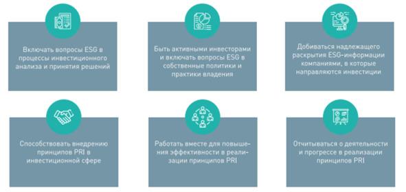 Важным шагом для привлечения устойчивых инвестиций стал запуск финансовой инициативы ЮНЕП (, в рамках которой были разработаны принципы устойчивого инвестирования. Опираясь на ESG-факторы, были сформулированы шесть добровольных принципов ответственных инвестиций (рис.2).