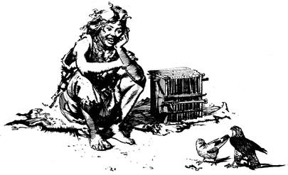 Он вспомнил про мачеху и начал прикидывать, может ли она выполнить свою угрозу и выкинуть весь его зверинец. Тогда не останется у него на свете ни единой радости. Он так привязался к своим питомцам! За сойку ему предлагали красивую кунью шкурку, но он все равно ее не отдал. Его сойка такая ручная, что ее можно оставлять в открытой клетке, — она знай себе весело скачет по хижине и подбирает с земляного пола желуди, которые там для нее разбросаны. Иногда Коротышка смеется над ней: мол, она лопнет, если будет так набивать свой зоб, ведь последний желудь уже торчит у нее из клюва, который птичка даже закрыть не может. Ненасытная! Но сойка просто скачет в дальний угол — там в щелях стены у нее есть тайничок (и знает о нем только Коротышка!) — и засовывает туда все желуди. Подпихивает их клювом, а потом опять торопится к Коротышке — выпрашивать добавку... а если не получает ее, то всю хижину осматривает, каждую щель клювом проверяет, веточки, валяющиеся у очага, переворачивает и разбрасывает, в шкуры звериные залезает, но оттуда уж ее Малиновка, шлепнув чем-нибудь, гонит вон. Сойка мгновенно прячется и мяукает потом, словно кошка. А Коротышка отвечает ей посвистыванием. Тогда сойка скрипит, как скворец, вылезает из укрытия, распушив хохолок, и распускает хвостик. Коротышка кидает ей желудь, и сойка катает его по земляному полу и играет с ним, как дите малое. Но птичка всегда настороже. Стоит Малиновке замахнуться на нее еловой лапой, как сойка — шррр! — вспархивает и садится на висящую на стене клетку: там-то она в безопасности.