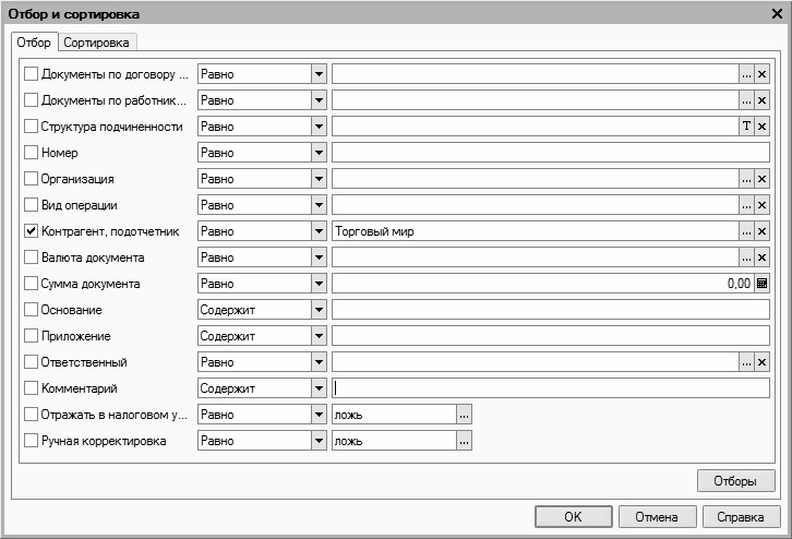 На вкладке Отбор осуществляется настройка параметров фильтра. В левой части вкладки содержится перечень условий фильтра (Номер, Организация, Вид операции и др.). Для выбора требуемого условия необходимо установить соответствующий флажок. Справа с клавиатуры либо помощью кнопки выбора указывается конкретное значение выбранного фильтра: например, на рис. 1.6 выбран фильтр Контрагент, подотчетник, а значение фильтра – Торговый мир. Между условием фильтра и его значением из раскрывающегося списка следует выбрать вариант применения фильтра (Равно, Не равно, В списке, Не в списке и др. – у разных условий фильтра разные варианты применения). Например, на рис. 1.6 для фильтра Контрагент, подотчетник выбран вариант Равно. Это означает, что после применения фильтра в списке останутся только документы, которые оформлены от имени контрагента Торговый мир. Если же установить вариант Не равно, то из списка будут исключены все документы, оформленные от имени контрагента Торговый мир (попросту говоря, с помощью варианта Не равно включается обратный фильтр).
