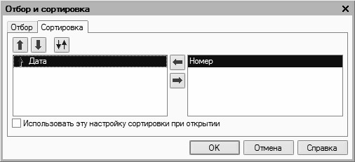 В правой части вкладки содержится перечень возможных признаков сортировки, в левой – те из них, которые необходимо применить. Перемещение признаков слева направо и наоборот осуществляется с помощью кнопок со стрелками, расположенных в центральной части вкладки. Порядок использования элементов сортировки и переключение направления сортировки осуществляется с помощью кнопок со стрелками, которые находятся слева вверху вкладки. Если установить флажок Использовать эту настройку сортировки при открытии, то при последующих открытиях окна списка все позиции в нем будут по умолчанию отсортированы в соответствии с текущими настройками сортировки.