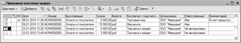 Рис. 1.3. Типичный интерфейс списка (приходные кассовые ордера)
