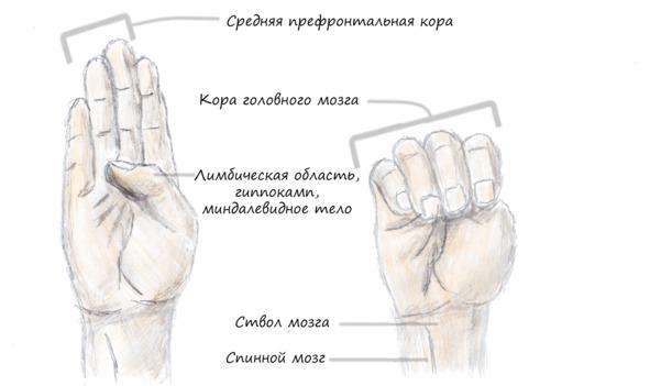 Для наглядности можно использовать модель мозга, предложенную Дэниэлом Сигелом [82]. Её можно сделать из собственной ладони. Для этого загните вовнутрь большой палец и остальные пальцы сожмите в кулак. Готово?