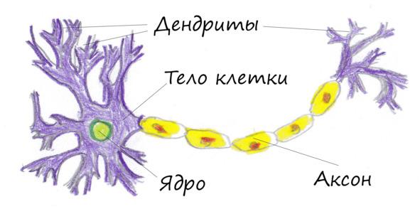 Тонкие отростки, отходящие от стенок нейронов, называются дендритами, а длинные нити — аксонами. Они передают сигналы от одного нейрона к другому. На рисунке ниже упрощенно изображено строение нейрона.