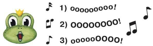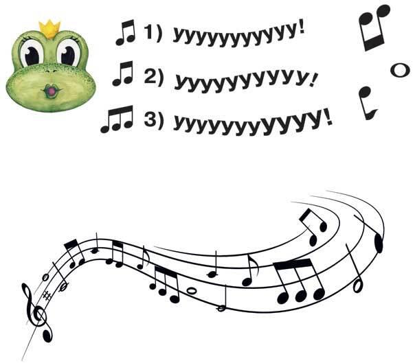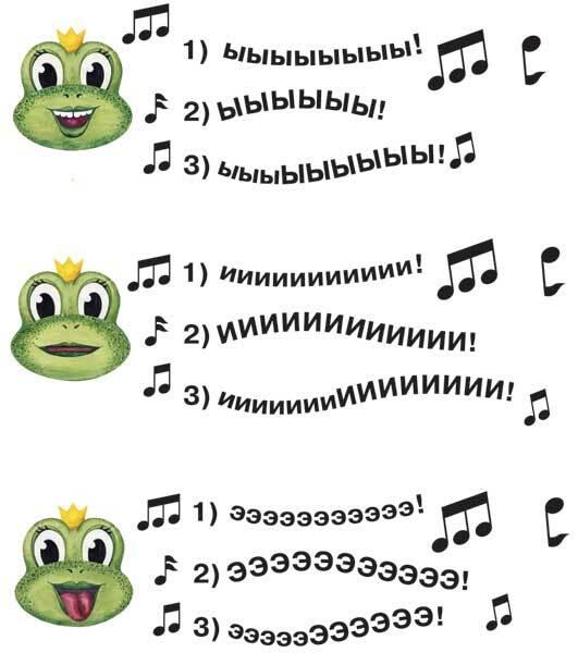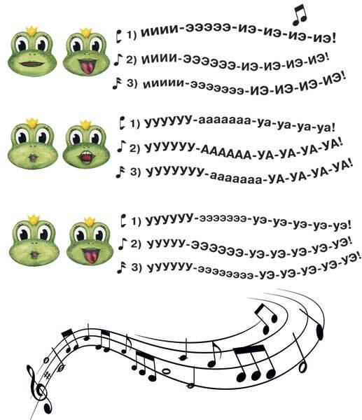 4. Спой перед зеркалом песенку лягушонка: 1) громко, 2) тихо, 3) постепенно увеличивай громкость. Широко открой рот, как лягушонок.