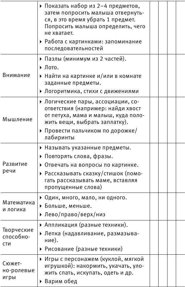 Обратите внимание: рекомендации, представленные в таблицах, рассчитаны на целый год! Они показывают, чему нужно научить малыша: