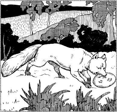 Тут дед смекнул, что лисичка-то была не мертвая; погоревал, погоревал, да делать-то нечего. А лисичка собрала всю разбросанную по дороге рыбу в кучку, села и ест себе. Навстречу ей идет волк: