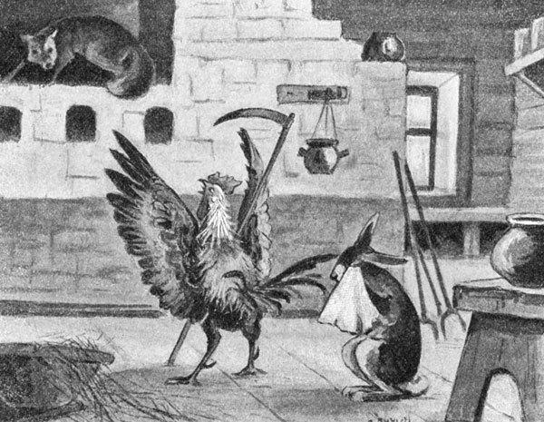 – Кукуреку! Несу косу на плечи, хочу лису посечи! Поди, лиса, вон!