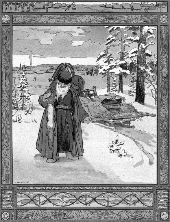 Жили себе дед да баба. Дед говорит бабе: «Ты, баба, пеки пироги, а я поеду за рыбой». Наловил рыбы и везет домой целый воз. Вот едет он и видит: лисичка свернулась калачиком и лежит на дороге.