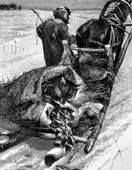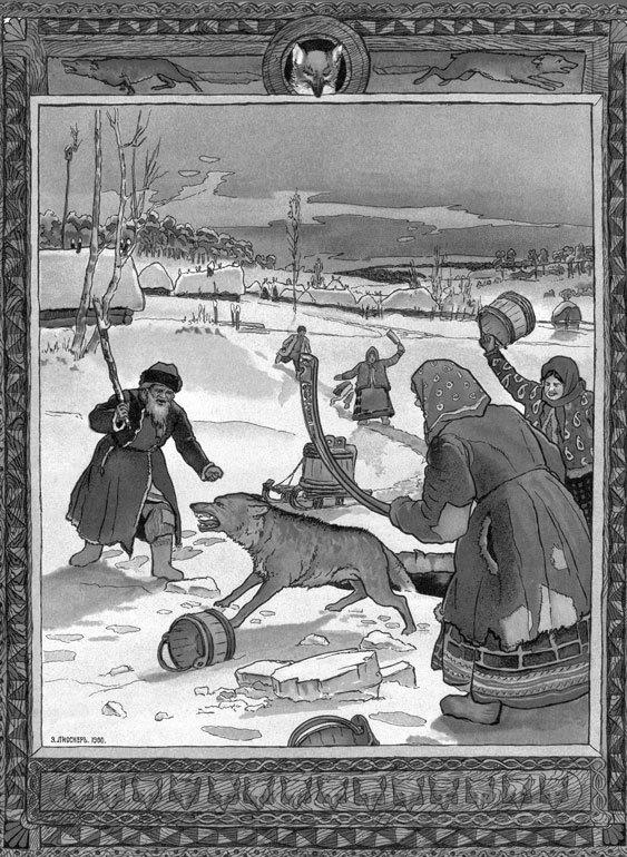 Узнал серый волк лукавство свиньи, насилу кое-как выбрался на берег и пошел с голодным брюхом рыскать по лесу. Долго издыхал он с голоду, не вытерпел, пустился опять к деревне и увидел: лежит около гумна* какая-то падла*.