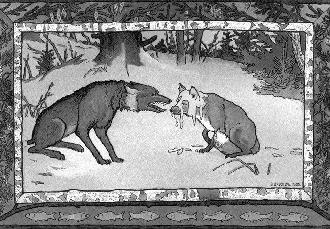 Волк пошел на реку, опустил хвост в прорубь; дело-то было зимою. Уж он сидел-сидел, целую ночь просидел, хвост его и приморозило; попробовал было приподняться: не тут-то было.
