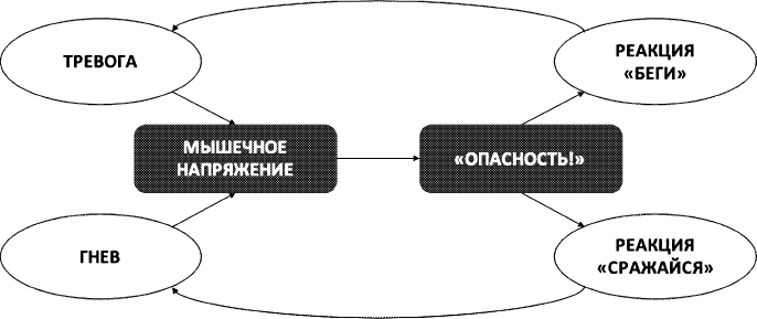 Частые, длительные, интенсивные эмоциональные переживания не могут не сказываться на нашем физическом самочувствии. Так, наиболее стрессовые эмоции тревога и гнев, являющиеся следствием искажённых мыслей, проявляются в виде мышечного напряжения, которое, в свою очередь, сигнализирует мозгу об опасности и необходимости активации защитных реакций «беги» или «сражайся», обусловливающих усиление соответственно тревоги или гнева (см. рис. 4). Этот порочный круг возникает потому, что психика и тело неразрывно связаны между собой. Помимо этого, будучи «воспитанными» и «культурными» людьми, мы подавляем, а не выражаем свои эмоции, в силу чего возникающее мышечное напряжение не расходуется, а накапливается, что приводит к мышечным болям, зажимам, спазмам и симптомам. Тело обмануть невозможно, ведь оно неизменно будет реагировать на избыточные эмоциональные реакции, а если и попытаться его обхитрить, оно обязательно ответит напряжением и симптомами. Важно понимать, что наше тело узнаёт о стрессовых реакциях гораздо раньше, чем вы успеваете осознать, что находитесь во власти той же тревоги или гнева. В этой связи мышечное напряжение довольно часто является индикатором острых или хронических стрессов. Таким образом, если мы научимся замечать это мышечное напряжение и расслабляться на физиологическом уровне, то сможем значительно снизить уровень эмоционального стресса. Помните: вы не можете испытывать выраженную тревогу или сильный гнев, если ваше тело абсолютно расслаблено, ведь где избыточные эмоции – там телесное напряжение, а где телесное напряжение – там избыточные эмоции. Поэтому если вы регулярно и последовательно занимаетесь мышечной релаксацией, автоматически понижающей уровень избыточных негативных эмоций, то в меньшей степени подвержены влиянию стрессовых факторов и гораздо чаще пребываете в спокойном состоянии.