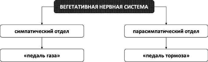 Однако нас будет больше интересовать автономный отдел нервной системы – вегетативная нервная система. Почему? А потому что мало того, что вегетативная нервная система – женщина сильная и независимая, потому как функционирует самостоятельно и не зависит от наших желаний, так она ещё и «вся такая противоречивая», поскольку состоит из двух отделов – симпатического и парасимпатического, выполняющих диаметрально противоположные функции. Если симпатический отдел отвечает за мобилизацию организма при реальной или даже представляемой в мыслях угрозе, то парасимпатический отдел расслабляет организм при отсутствии каких-либо угрожающих событий или мыслей о потенциальной опасности. При этом неважно, угрожает ли вам реальная опасность или вы просто нарисовали в своём творческом воображении катастрофическую картину, как самолёт, на котором вы завтра полетите, упадёт на поезд, в котором по роковому стечению обстоятельств будет ехать ваш друг. В любом случае начнёт усиленно работать симпатический отдел, который мобилизует ваш организм для бегства, сражения или замирания с целью выживания, чтобы вы были готовы действовать по тысячелетиями вырабатывавшемуся эволюцией механизму. Поэтому заслуженную порцию адреналина и кортизола вы точно получите. Конечно, вы будете испытывать и телесные симптомы. Изволите тревожиться сами – извольте и тело побеспокоить. Но, когда реальная или представляемая опасность сойдут на нет, в дело вступит парасимпатический отдел и вы начнёте отдыхать. Итак, вегетативная нервная система без вашего участия подстраивает работу организма под различные стрессовые события. И это существенно экономит время, ведь вряд ли вы говорите: «Сердце, бейся быстрее!» или: «Кишечник, давай-ка поработаем в усиленном режиме! Хорош уже халтурить!» Для наглядности отделы вегетативной нервной системы можно условно обозначить как педали газа и тормоза, отвечающие, соответственно, за реакции стресса и релаксации (см. рис. 2).