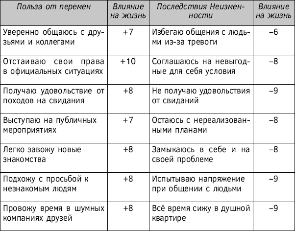 Помимо формулирования цели вам также важно составить таблицу мотивации, где вы пропишете конкретные элементы, из которых состоит ваша общая цель. Иными словами, в таблицу мотивации заносятся все предстоящие жизненные перемены, которые оцениваются от 0 до +10 по степени их значимости для вас, а также последствия неизменности, которые оцениваются аналогично, но зеркально: от 0 до –10. Итак, левая часть таблицы будет содержать пользу от перемен, то есть описание того, как вы будете жить после преодоления стресса (изменения важно описывать в прошедшем времени, как будто то, о чём вы пишете, уже осуществилось, словно вы уже так живёте). Правая часть таблицы будет содержать последствия неизменности – описание того, что будет происходить, если вы продолжите оставаться в своей эмоциональной проблеме (см. табл. 1).