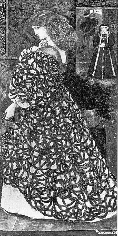 Еще до свадьбы влюбленный Моррис написал замечательную картину «Королева Гвиневра», для которой позировала Джейн. И сюжет из картины повторился в жизни, Моррис оказался в роли обманутого короля Артура, а его Гвиневра-Джейн была влюблена в Ланселота-Россетти. Их роман длился много лет, вплоть до смерти Россетти, Джейн была его моделью и возлюбленной, оставаясь супругой Морриса, который не считал возможным проявлять ревность, так как уважал свободу чувств своей жены. А поскольку развод вызвал бы скандал и повредил детям, Моррисы сохраняли статус-кво. Так появился первый любовный треугольник, но он вскоре увеличил количество углов.