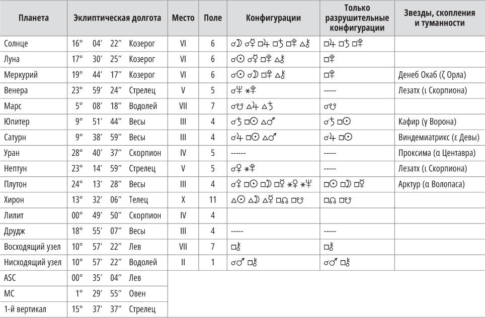 ●на VI месте карты находятся Меркурий, Марс, Сатурн, Уран, Нептун или Плутон, имеющие хотя бы одну разрушительную конфигурацию с другой планетой или Лилит либо конъюнкцию или квадратуру с нисходящим (южным) узлом;