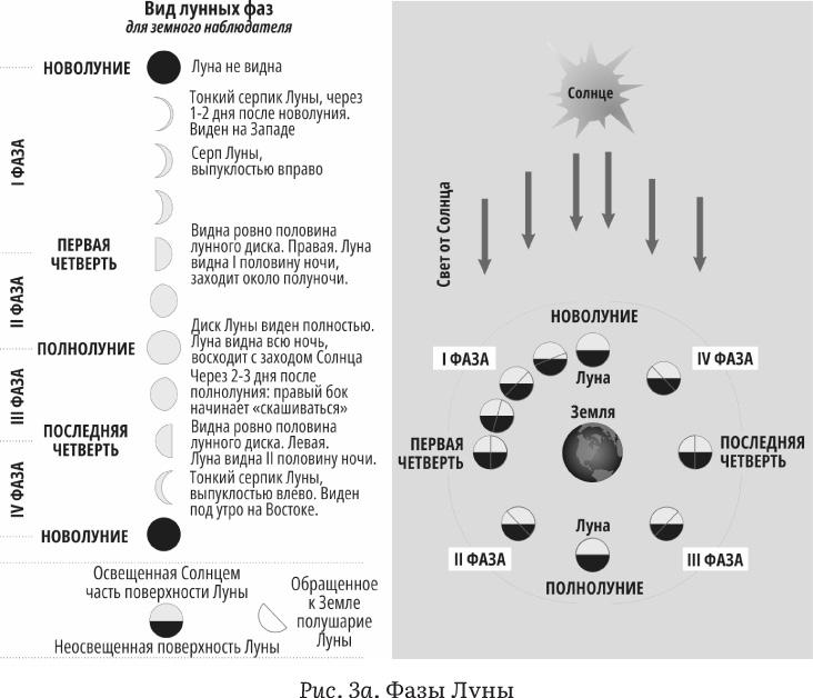 Луна. Естественный спутник Земли. Единственный физический объект, используемый в астрологии, который движется непосредственно вокруг Земли. Луна — второй по величине объект на нашем небе. Характерной особенностью Луны являются ее фазы — отношение освещенной Солнцем поверхности ее диска к неосвещенной части (см. рис. 3а). Цикл смены лунных фаз длится 29,5306 дня, а один оборот по небу Луна совершает за 27,3212 дня.