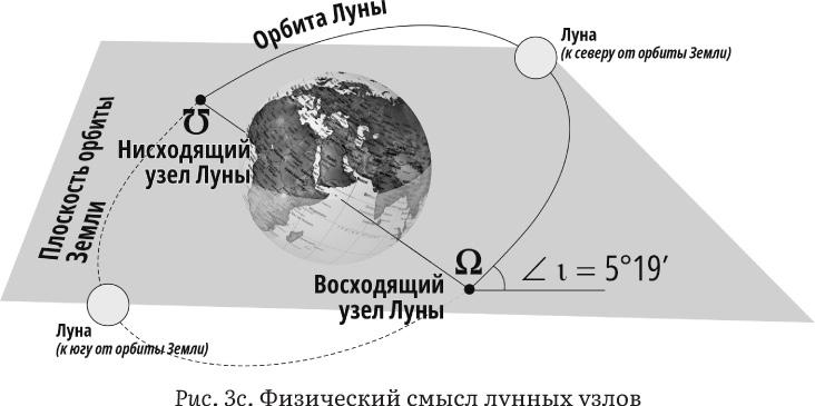 Лунные узлы. Это не планеты! Это не физические объекты, не небесные тела, их нельзя увидеть на небе. Тем не менее это точки, имеющие строго определенный астрономический смысл, — это точки пересечения орбиты Луны с орбитой Земли (эклиптикой) (см. рис. 3с). Лунных узлов два — восходящий, или северный, и нисходящий, или южный. В астрологии лунные узлы являются показателями кармы.
