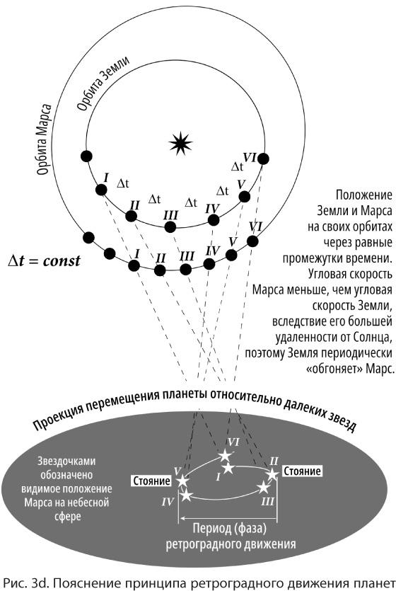 Все объекты планетарного типа — Меркурий, Венера, Марс, Юпитер, Сатурн, Уран, Нептун, Плутон и Хирон — периодически бывают в ретроградном движении. Ретроградное движение — это такой вид перемещения планеты на небе, при котором наблюдателю с Земли кажется, будто планета движется в обратном направлении (относительно своего основного движения и направления перемещения Солнца). Принцип ретроградного движения можно ощутить при езде на автомобиле. Представьте, что вы едете по трассе и начинаете обгон другого автомобиля. На самом деле вы оба движетесь в одном направлении, но, когда вы обгоняете, вам начинает казаться, что второй автомобиль на фоне дальнего пейзажа как бы двигается обратно по отношению к вам (см. рис. 3d).