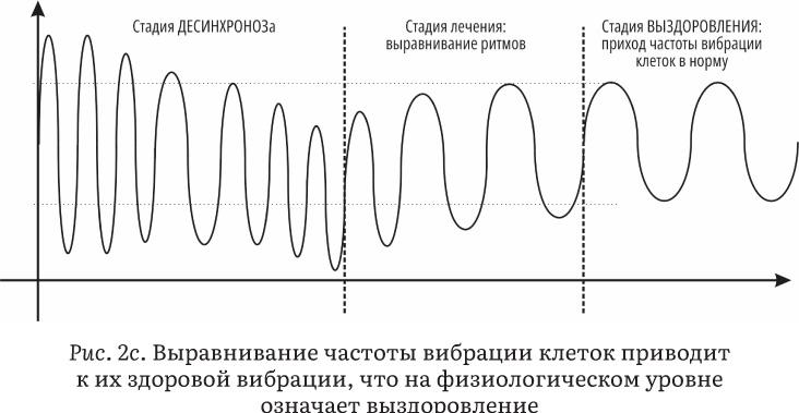 Но если негативным эмоциям удается надолго захватить психику человека, то у него развивается состояние психологического негатива, подавленности, уныния и тоски, и в итоге начинается депрессия. Когда мозг испытывает состояние психологической подавленности, он начинает производить сигналы, которые угнетают клетки иммунной системы. Если это состояние становится продолжительным (например, при депрессии), то мозг в течение длительного времени дестабилизирует работу иммунной системы. В результате чего ее работа нарушается. Это состояние называется десинхронозом — полным нарушением ритмов вибрации клеток (см. рис. 2b).