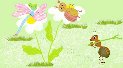 Сів він на другу ромашку, вітерець дме, ромашки колишуться, а бабці і хрущику весело. Гой-да, гой-да.