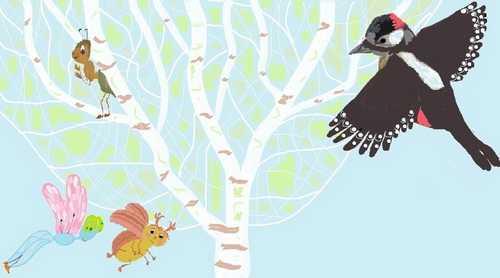 Раптово величезна тінь закрила сонячні промені. Бабка і жук швидко полетіли з берези, а маленький мураха сховався між гілок. Це дятел прилетів на березу і постукав своїм дзьобом. Дятел відчував, що мураха десь близько. Він висунув довгий язик і намагався захопити мурашку між гілок. Мураха дуже злякався. Він шукав щілину, куди можна забитися від страшного дятла.
