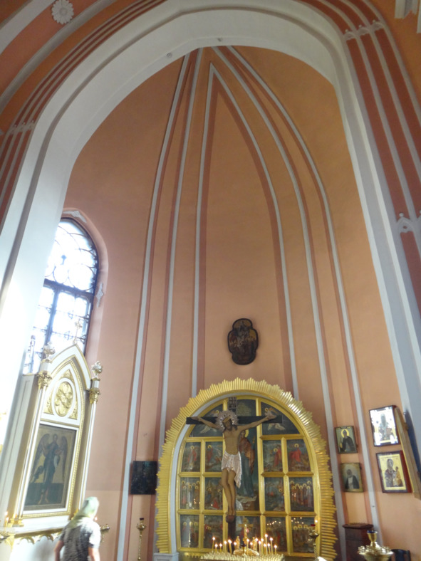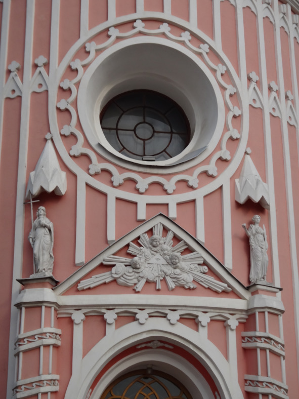 Однако, наружное убранство пробуждало особые ощущения. Ю.М.Фельтен элегантно оформил фасады изящными вертикальными тягами и стрельчатыми арочками. Белоснежной тональности, они мягко контрастировали с выкрашенными в бледно-розовый цвет стенными поверхностями. Зодчий как бы попытался спрятать «классицизм» под ажурной «готической» декорацией. И ему, в самом деле, удалось добиться сногсшибательного эффекта. Тонкие линии фасадных членений выразительно перетекали в возвышающиеся над карнизами башенки-пинакли с высокими пирамидальными кровлями. Над входом в храм было помещено круглое окно, как бы имитирующее «розы» старинных готических церквей. Заострённые игольчатые формы также обрамляли барабаны и делали почти незаметными маленькие гранёные купола — нежно-серого цвета, в целом, созвучного общей колористической гамме постройки.