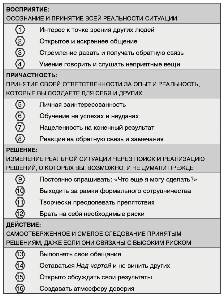 Исходя из этого, мы предлагаем новое определение ответственности, более позитивное и мощное, а именно: «Ответственность — это личный выбор подняться над своими обстоятельствами и показать вовлеченность, необходимую для достижения ключевых результатов: восприятия, причастности, решения и действия». Представьте себе, какое влияние на эффективность отдельного человека, команды и целой организации окажет такой поистине революционный подход к выполнению задач!