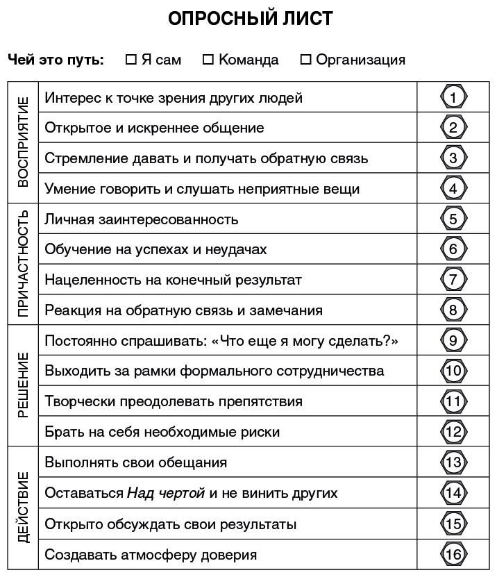 Ознакомив читателей с четырьмя Ступенями к ответственности в «Принципе Oz» (Восприятие, Причастность, Решение и Действие), мы изучили передовой опыт, который продемонстрировали люди, команды и организации, успешно прошедшие эти ступени. Мы также изучили общие проблемы, с которыми сталкиваются организации и руководители при формировании культуры ответственности. В самых разных отраслях, от ядерной энергетики до банковского дела и медицинского оборудования, мы начинали с оценки, включающей следующие вопросы: